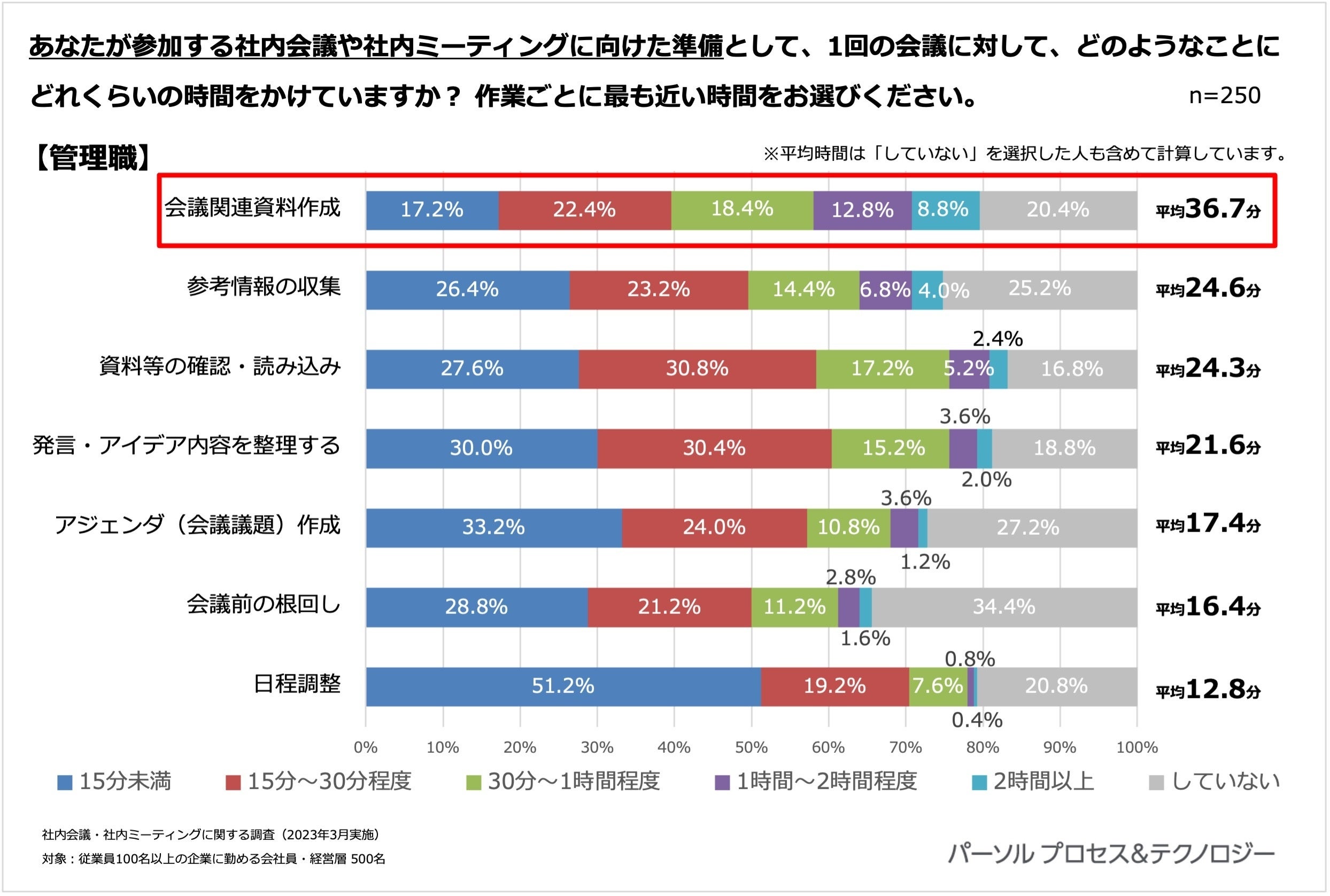 会議の準備作業をしている人のうち、最も多く時間をかけているのは「会議関連資料の作成」で、管理職では平均36.7分、一般社員では平均26.9分、かけていることわかりました。
