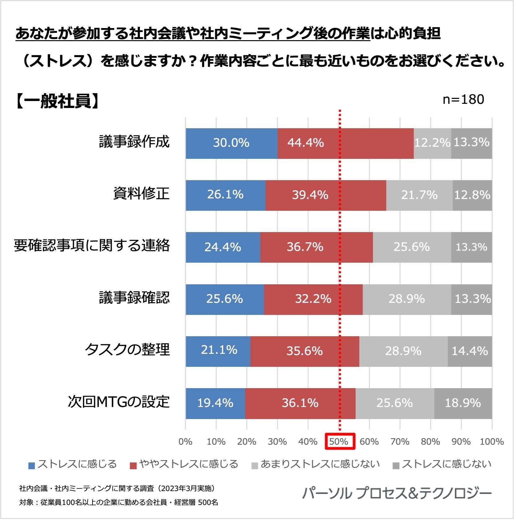 全体を通してみると、一般社員の方がストレスを感じている割合が高い結果となりました。会議における準備・作業時間は管理職のほうが長い一方で、ストレスの感じやすさは一般社員の方が高い傾向が読み取れます。
