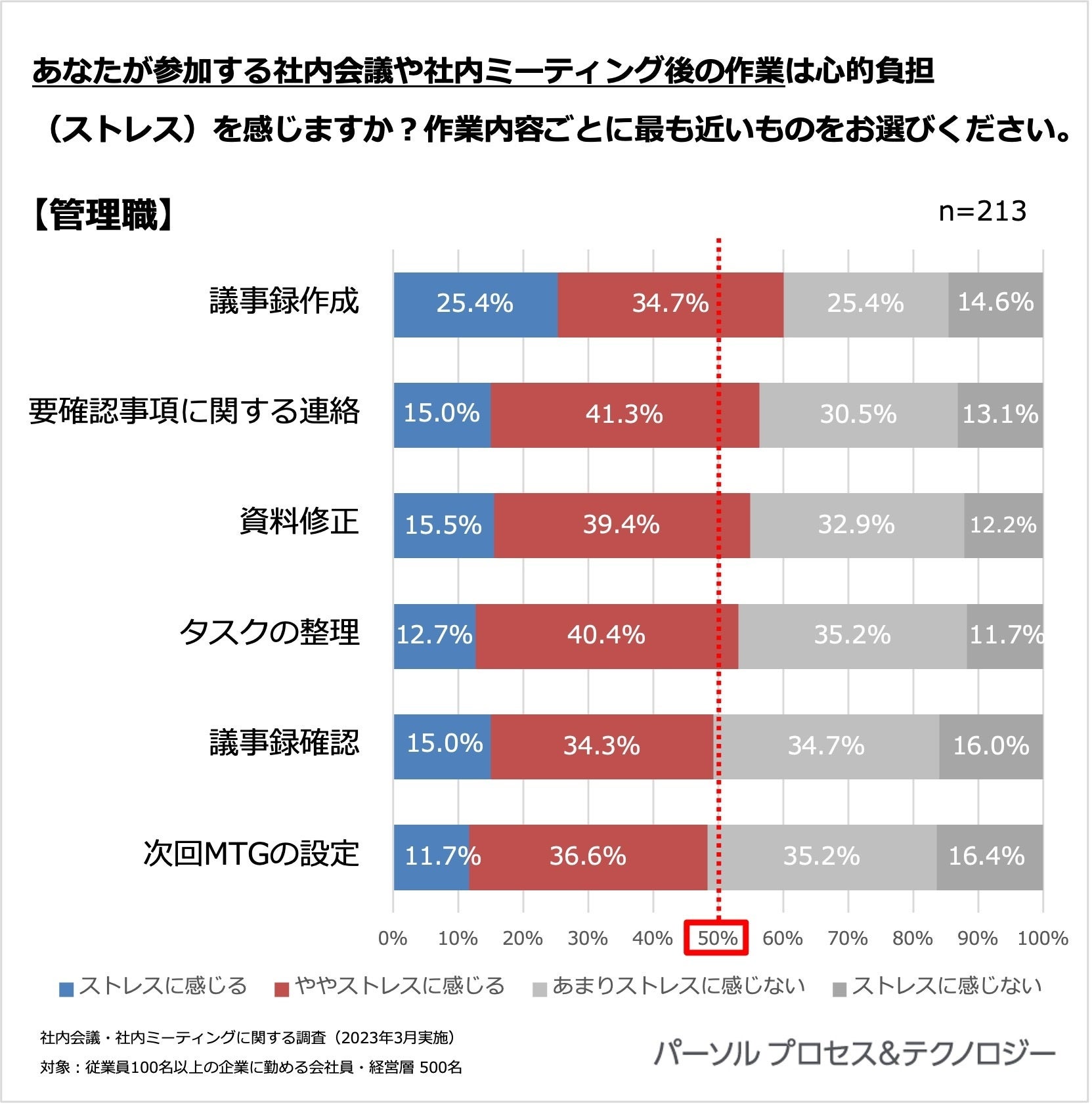 あなたが参加する社内会議や社内ミーティング後の作業は心的負担(ストレス)を感じますか?