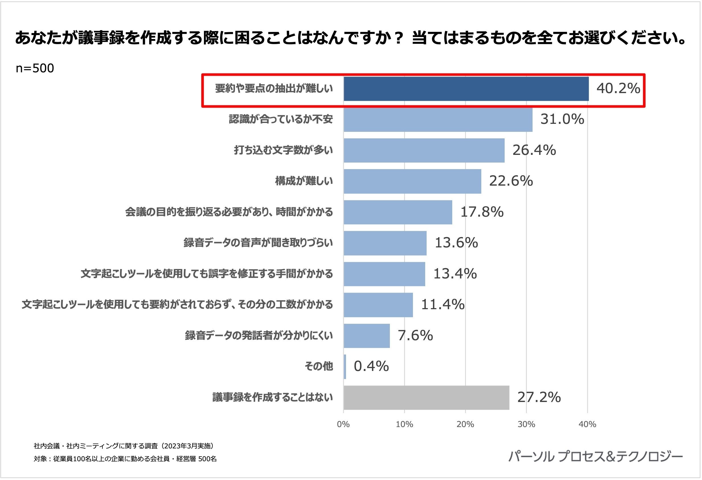 会議後の作業として最も多く時間がかかっている要因の一つとして「要約や要点の抽出が難しい」という課題が伺えます。