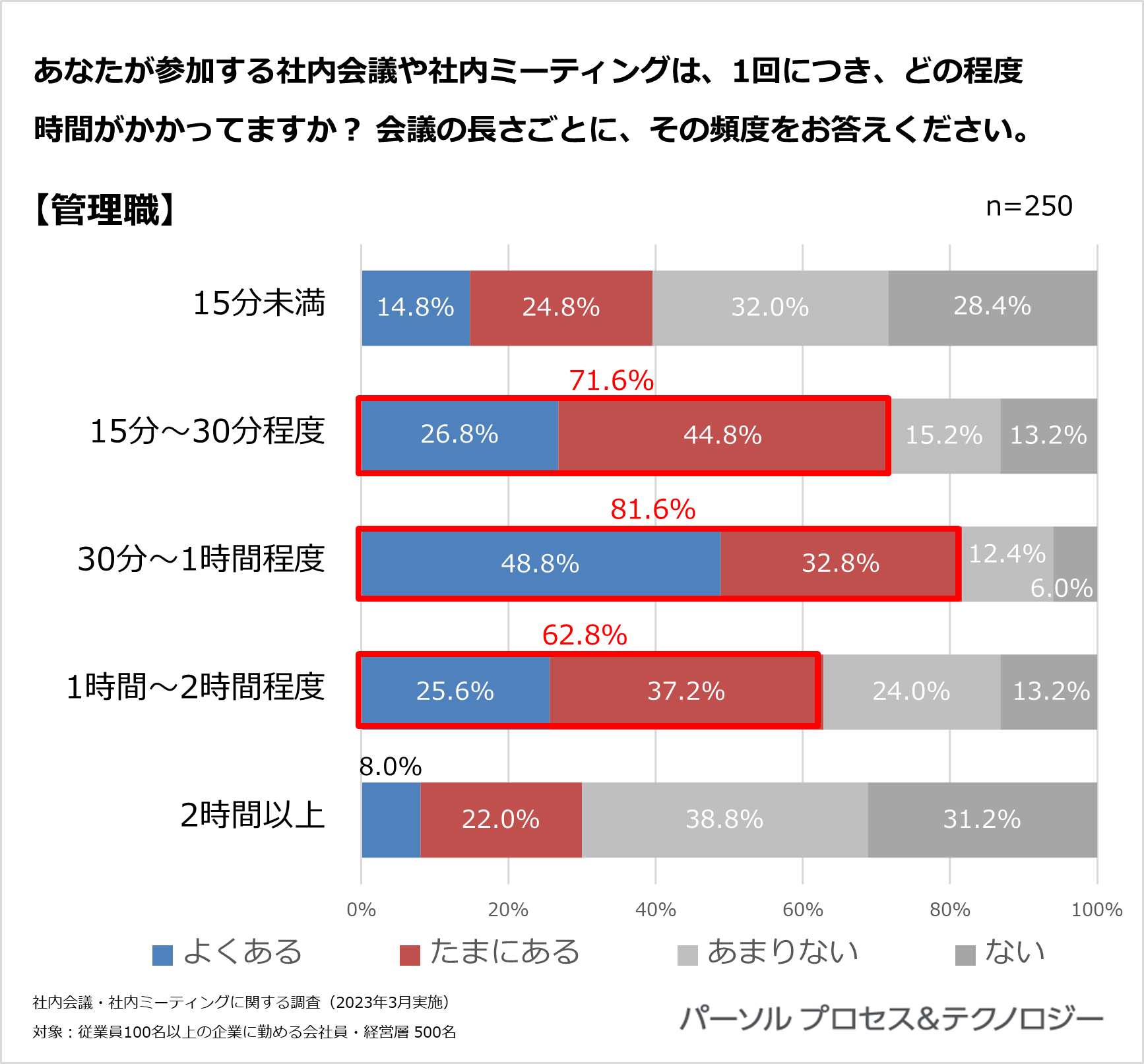 会議の長さごとに、その頻度をお答えください。(n=500<管理職250 一般社員250>、単一回答)