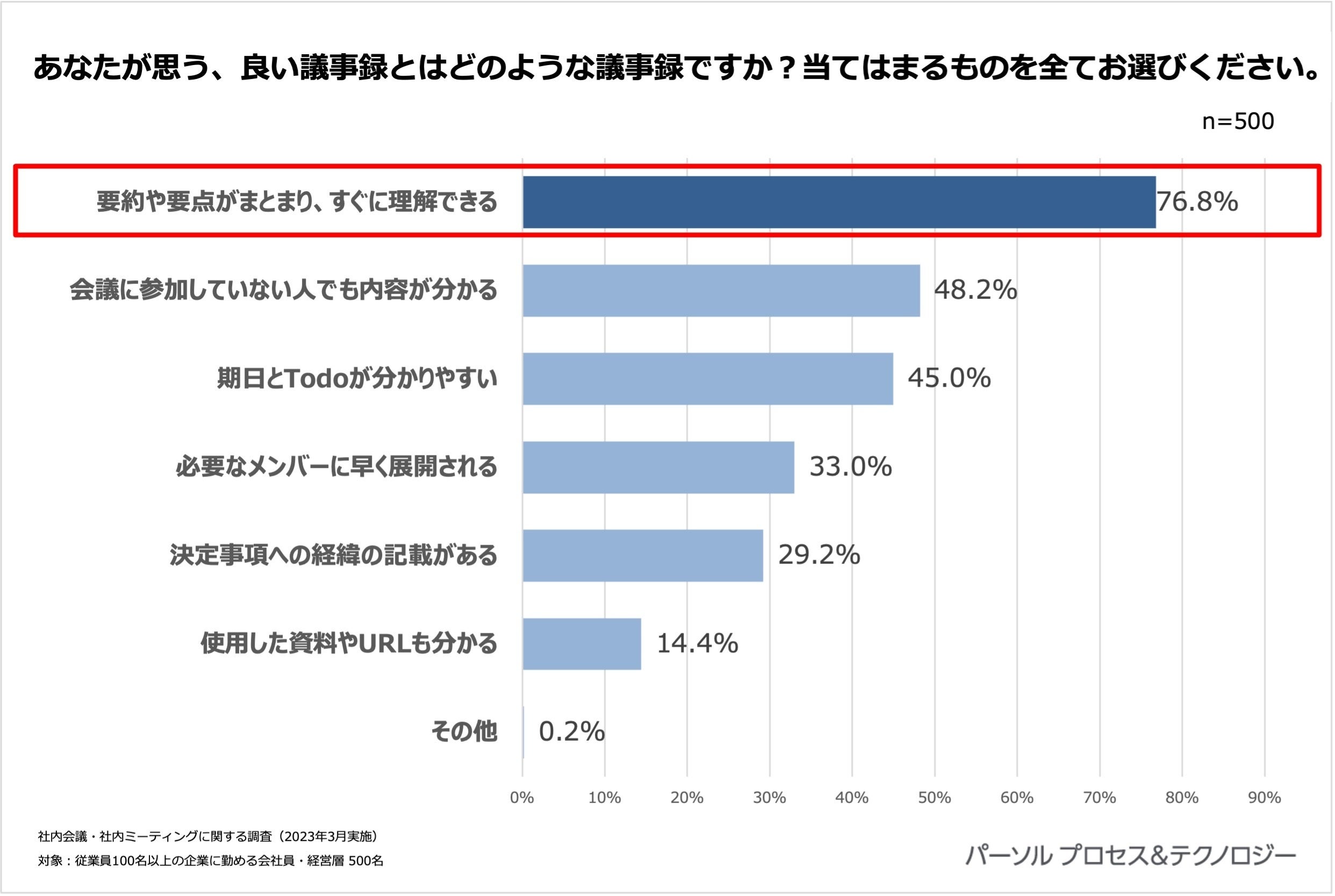 良い議事録として、8割近くの人が「要約や要点がまとまり、すぐに理解できる」(76.8%)を選択。次いで「会議に参加していない人でも内容がわかる」(48.2%)、「期日とTodoが分かりやすい」(45.0%)と続きました。会社で求められる議事録として、要約や要点がまとまっていることに対する評価やニーズが特に高いことが伺えます。