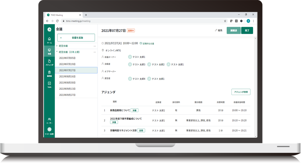 「TIMO Meeting」は、会議前~会議後までのプロセスをデジタル化と一元管理を通じて「会議品質の向上、会議時間の削減」を実現するミーティングマネジメントツールです。「会議運営の効率化」や「アジェンダコントロール」 「会議の質向上」につながる機能を搭載し、メンバー レベルの会議から経営会議に至るまで対応します。