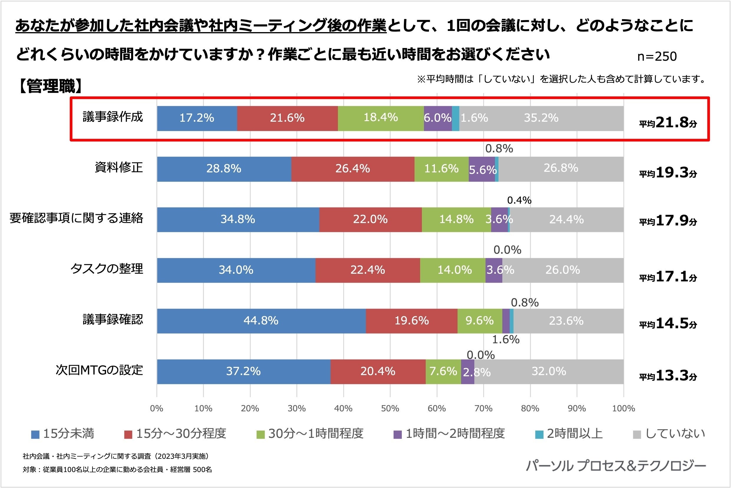 会議後の作業として最も多く時間をかけているのは、管理職も一般社員も共に「議事録作成」となりましたが