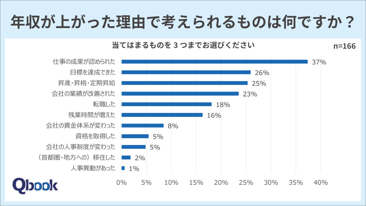 (2)年収増加の要因で最多が「仕事の成果が認められた」。「転職」は上から5番目の結果に