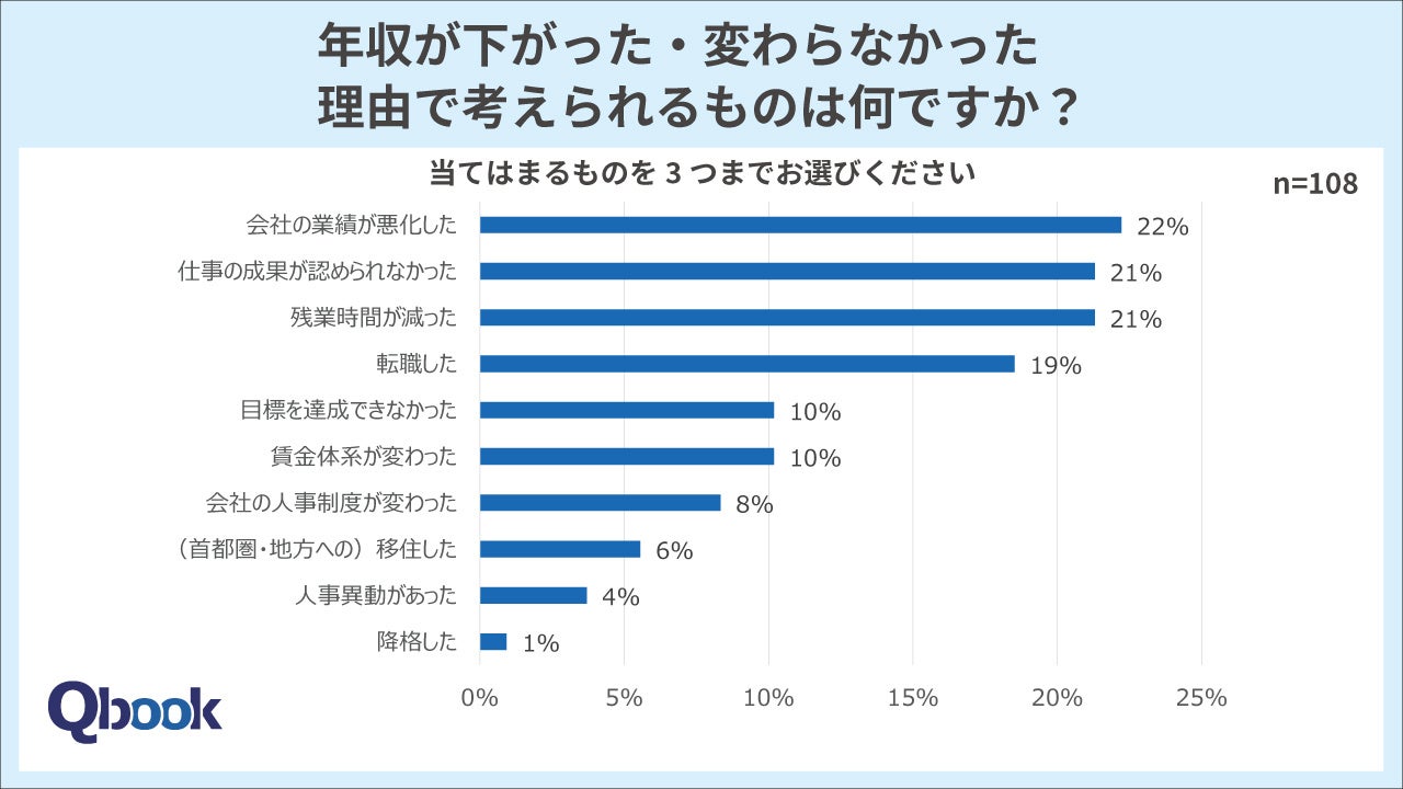 年収が「下がった」と回答された方の中で最も多い理由が「会社の業績悪化」でした。続いて「仕事の成果が認められなかった」、「残業時間が減った」と続く結果となりました。