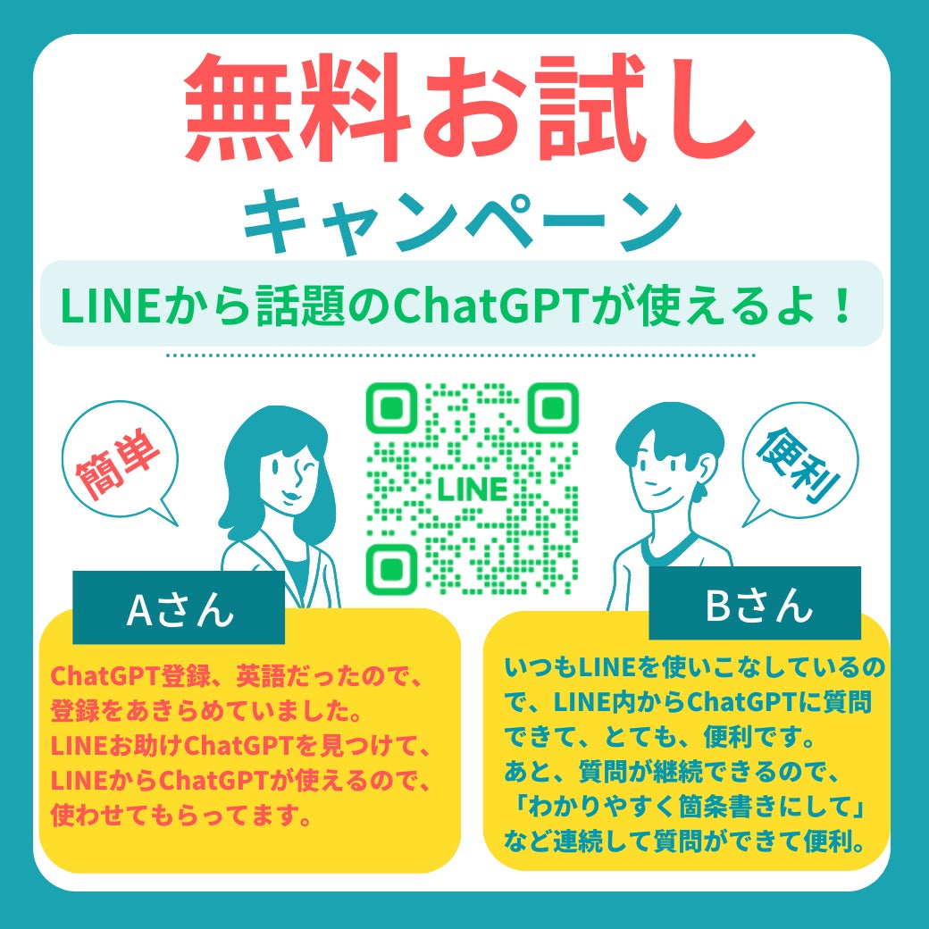 LINEチャンネルお助けChatGPTは、LINEを通じて友達と会話しているかのように、話題のChatGPTに質問ができるサービスです。継続して質問・回答が可能で、より詳細な情報が得られます。
