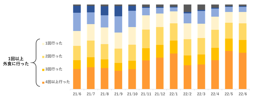 18時以降のディナータイムに「積極的に外食する」が5カ月連続で増加し72.1%(前月差:+4.7pt)となりました。中でも「誰とでも外食する」が21.7%(前月差:+3.7pt)となり、これを牽引したといえます。また、直近1カ月以内において”実際に外食に行った“割合は91.1%。このうち「4回以上」が40%を上回っています。