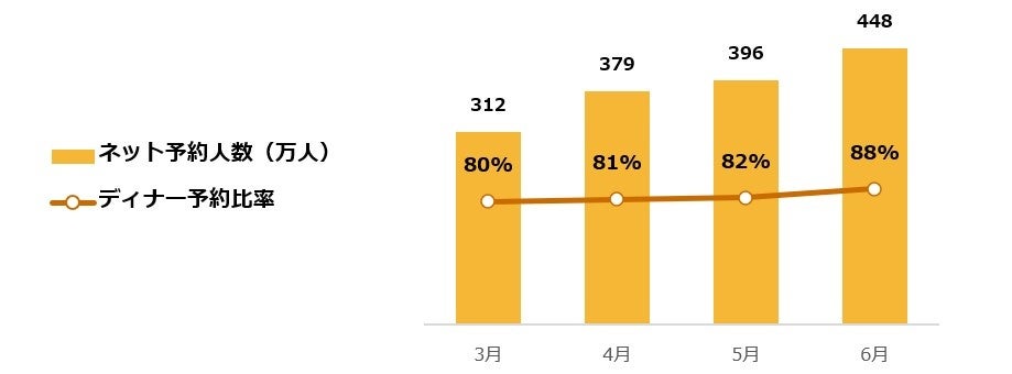 食べログのネット予約人数は、2022年6月において約450万人。うち88%がディナ―タイムにおける予約です。