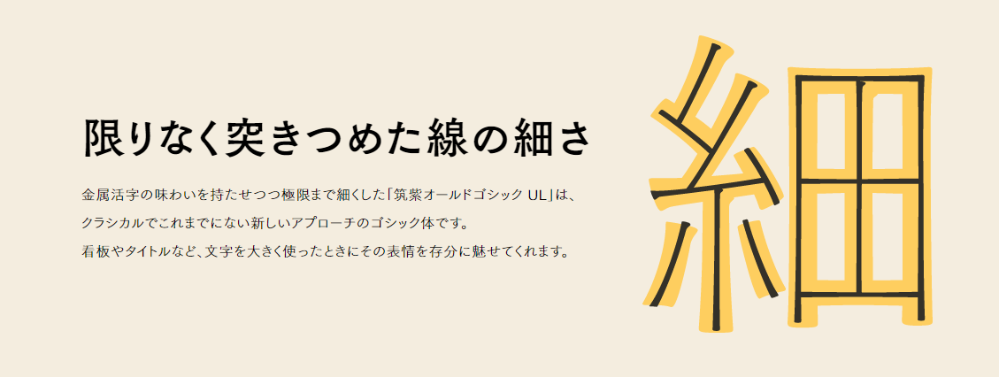 そんな書体の新ウエイトとして今回登場するのが「筑紫オールドゴシック UL(ウルトラライト)」です。
