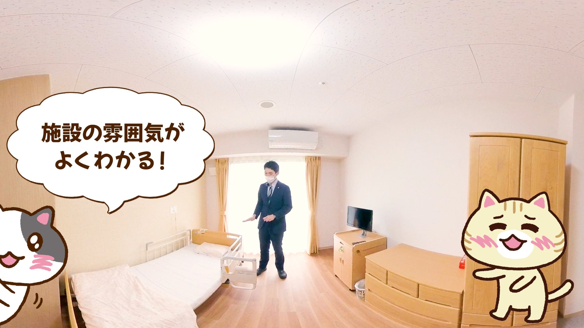 こちらのリンク先から「VR施設見学動画」をご覧頂くことができます。リーズナブルな価格帯の老人ホームから、超高級老人ホームまでバリエーション豊かなラインナップを取り揃えておりますので、介護当事者の皆さまに限らず、ぜひ一度、皆さまにご覧頂ければ幸いです。