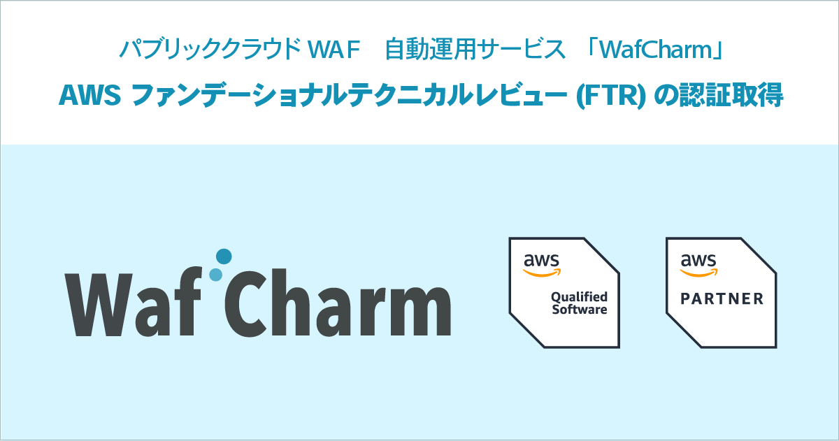 今回 AWSのベストプラクティスに沿って、ソリューションや製品のセキュリティ、信頼性、運用上の優秀性などのリスク検証が行われ、必要とされる基準を満たしたことにより、「WafCharm」がAWSファンデーショナルテクニカルレビュー(FTR)を通過し、「AWS認定ソフトウェア」として認定されました。