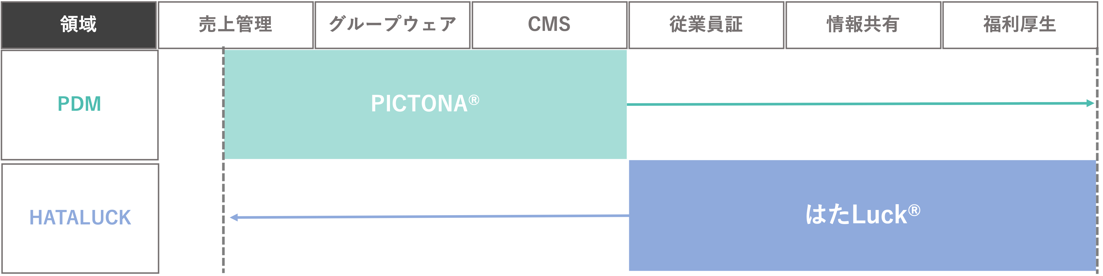 「はたLuck®︎」はこれまで、デジタル入館証やお知らせの一斉配信などの機能によりSC運営のDX化を促し、生産性向上を支援してきましたが、それだけではフォローしきれない部分があったのも事実です。またPDMが提供する「PICTONA®︎(ピクトナ)」においても「グループウェア」や「CMS」などの機能でSC運営をサポートする一方で、入退館管理などはカバーしていない分野でした。