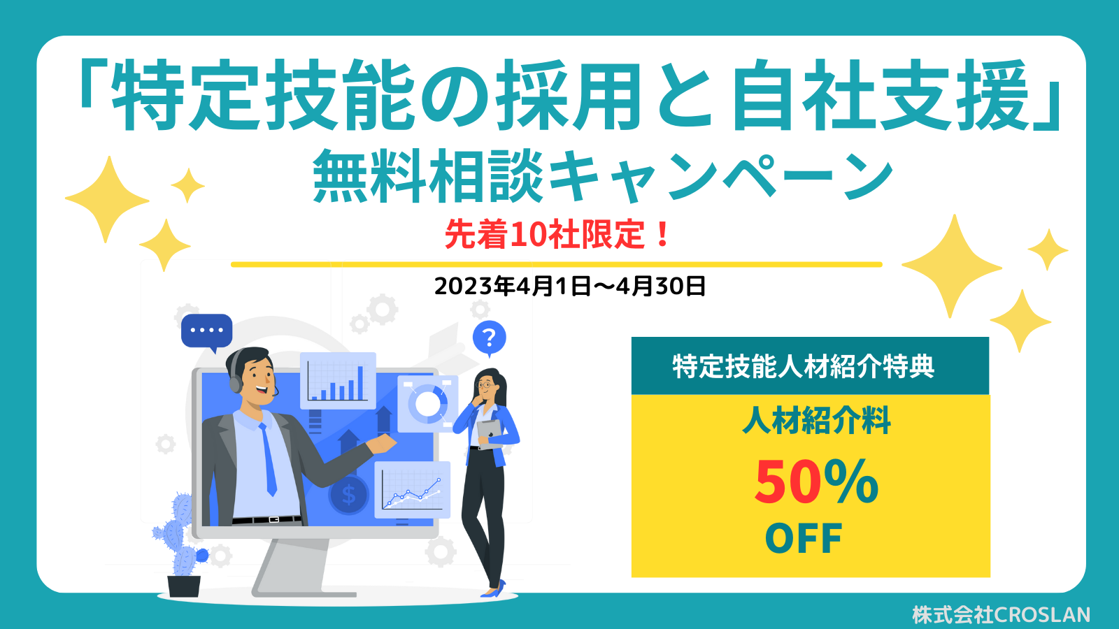株式会社CROSLANは、全国の特定技能外国人を雇用する受入れ企業様の皆様へ向けた「特定技能自社支援に関する無料相談」キャンペーンを、2023年4月1日(土)より開始いたします。