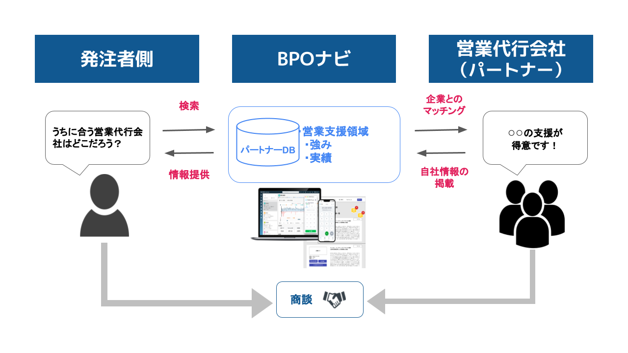 ※BPOとは:Business Process Outsourcing(ビジネスプロセスアウトソーシング)の略で、自社の業務プロセスを外部の専門的な企業に委託することです。「BPOナビ」では営業活動に関する外部委託を対象としています。
