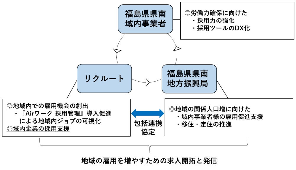 地域や中小企業においては、採用業務のデジタル化がまだまだ進んでいないという現状も鑑み、当社が提供する業務・経営支援サービスである「Air ビジネスツールズ」、および人材ソリューションのノウハウをご活用いただくことで、採用業務のデジタル化を進め、移住促進と地域定着、域内事業者の雇用促進により、福島県県南地方の地域活性化に貢献していきたいと考えています。