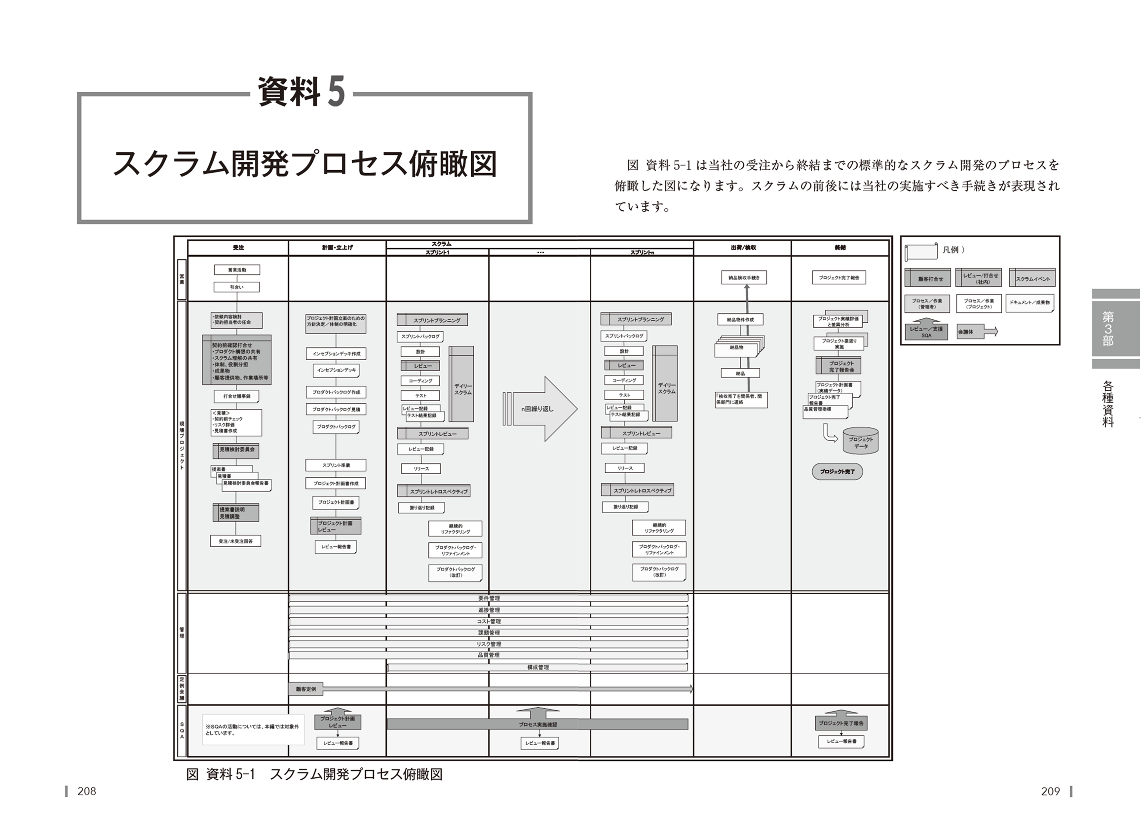 資料5では当社スクラム開発におけるプロセスの俯瞰図を掲載。スクラムのプレイヤーがプロジェクトに参画した当初から知っておくと役立つ手続きなどを紹介しています。
