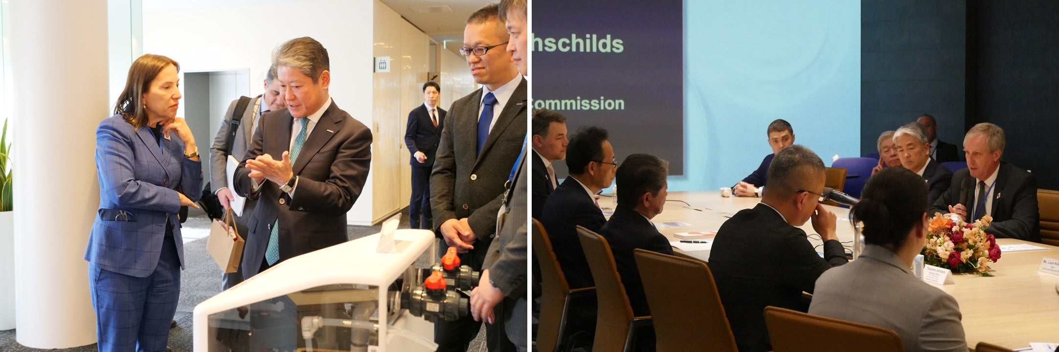 当社からは、独自の熱回収技術に加えIoTを使ったモニタリングやデマンドレスポンス機能により電力負荷平準化を実現するヒートポンプ式温水給湯暖房機(Air to Water)や、北米でシェア1位を獲得してきたEV向け電池事業などカーボンニュートラルに貢献する技術、当社環境ビジョンの説明を行い、パナソニックセンター東京に設置されたCommunity、Mobility、Lifestyleを支えるソリューション、そしてCES2023でも注目を浴びたペロブスカイト太陽電池を見学いただきました。