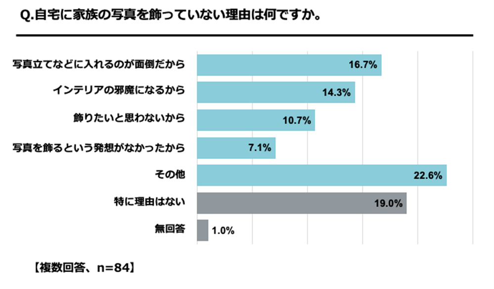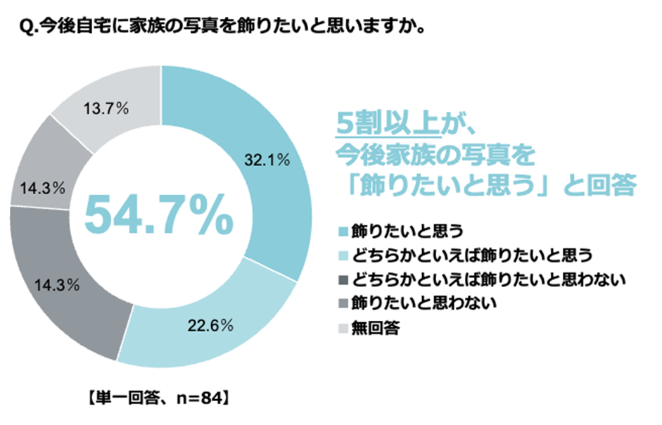 一方で、家族の写真を自宅に飾っていない人にその理由を聞くと、「写真立てなどに入れるのが面倒だから」(16.7%)が1位となり、飾るまでの手間を惜しんでいるという状況が浮かび上がりました。さらに、現在家族写真を飾っていない人の2人にひとり以上(54.7%)は「飾りたい」と回答するなど、飾る手間がハードルとなっているものの、家族の写真を飾りたいという思いはあるということが分かりました。