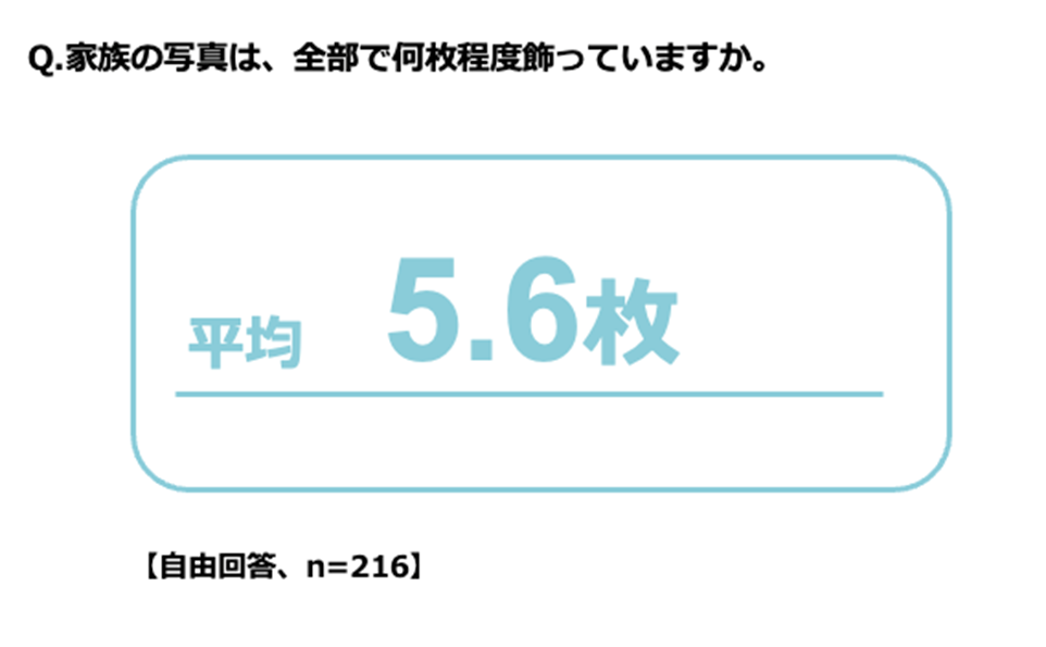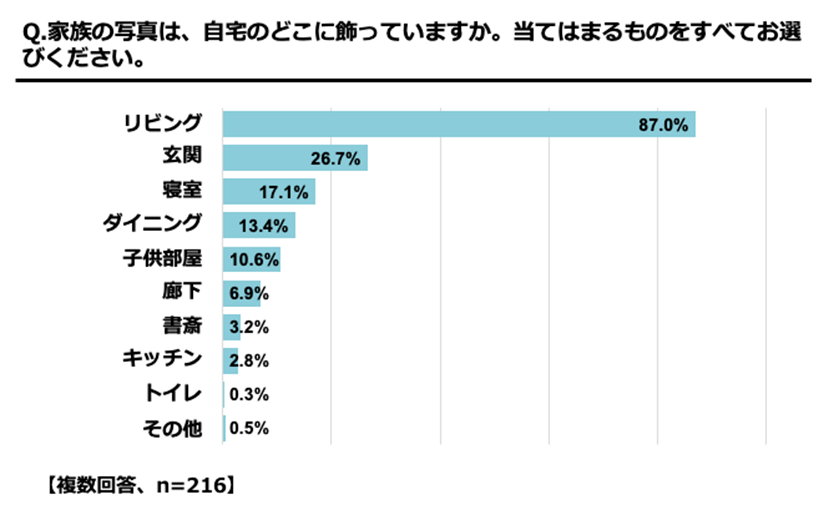 - 自宅に飾っている家族写真の平均枚数は「5.6枚」。飾っている場所1位は「リビング」(87.0%)、飾り方1位は「写真立て」(77.3%)<結果3>