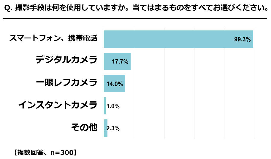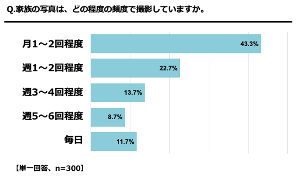 - 家族写真の撮影頻度1位は「月1〜2回程度」(43.3%)。撮影手段は、9割以上(99.3%)が「スマートフォン、携帯電話」を使用<結果1>