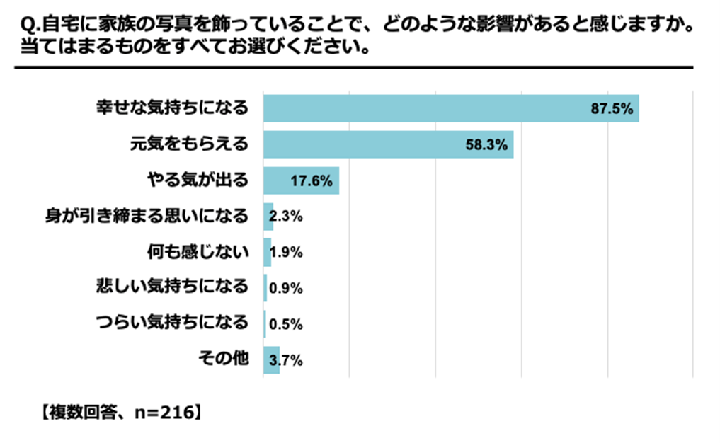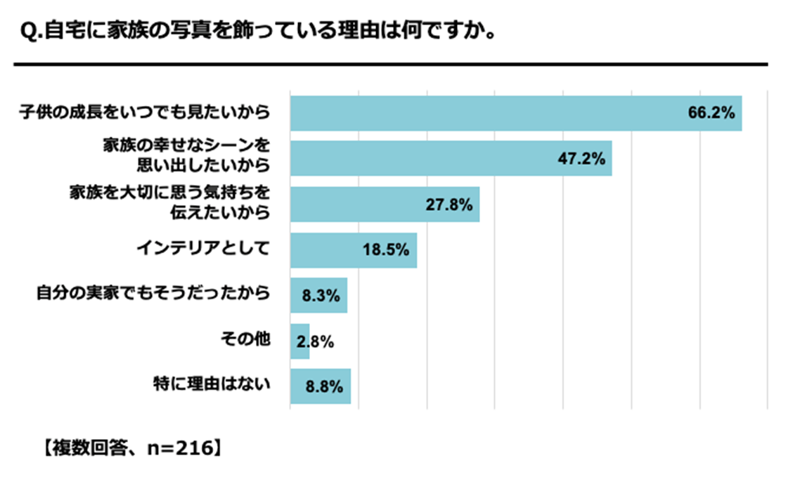 - 自宅に家族写真を飾っている理由1位は「子供の成長をいつでも見たいから」(66.2%)。8割以上(87.5%)の人が、自宅に家族写真を飾っていることで「幸せな気持ちになる」と回答<結果4>