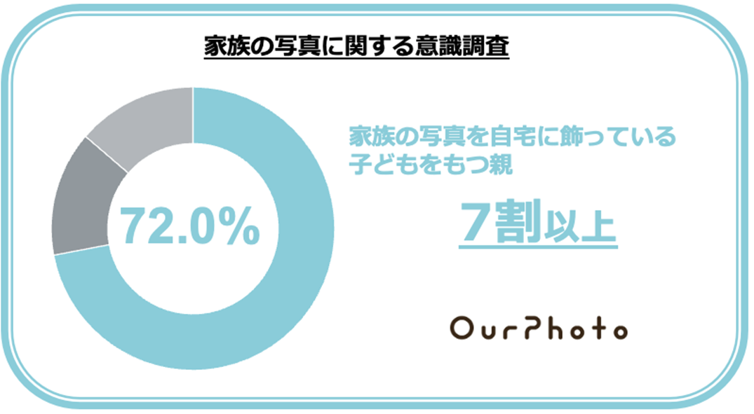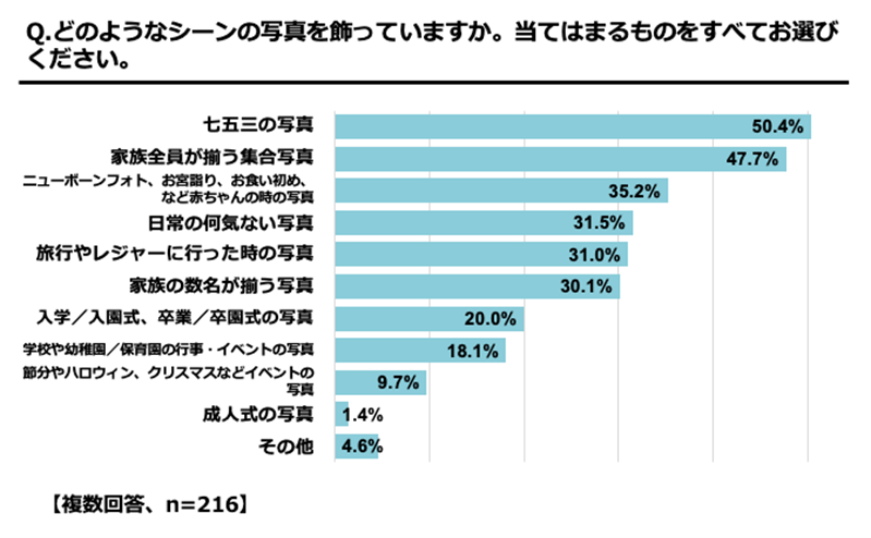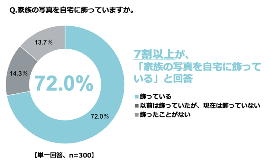 - 7割以上(72.0%)が「家族の写真を自宅に飾っている」と回答。飾っているシーンは「家族全員の集合写真」(47.7%)を抑えて「七五三」(50.4%)が1位に<結果2>