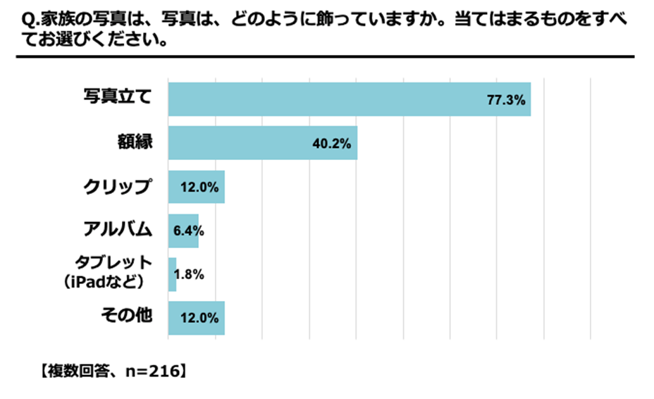 自宅に飾っている家族写真の枚数を聞くと、平均「5.6枚」という結果に。飾っている場所では、1位「リビング」(87.0%)に次いで、「玄関」(26.7%)、「寝室」(17.1%)と、日常で目に触れやすい場所に家族の写真を飾っていることがうかがえます。また、家族写真の飾り方を聞くと、「写真立て」(77.3%)が最も多い結果となり、「額縁」(40.2%)、「クリップ」(12.0%)が続きました。