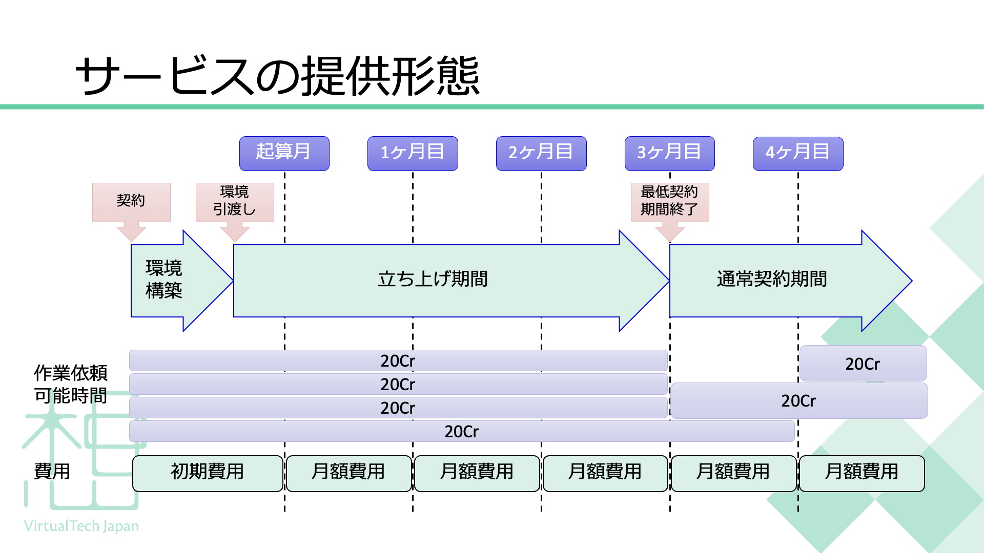 環境構築後に環境を引き渡した月の月末までは初期費用の範囲となり、その翌月から月額費用の請求が始まります。