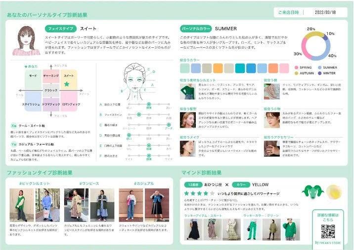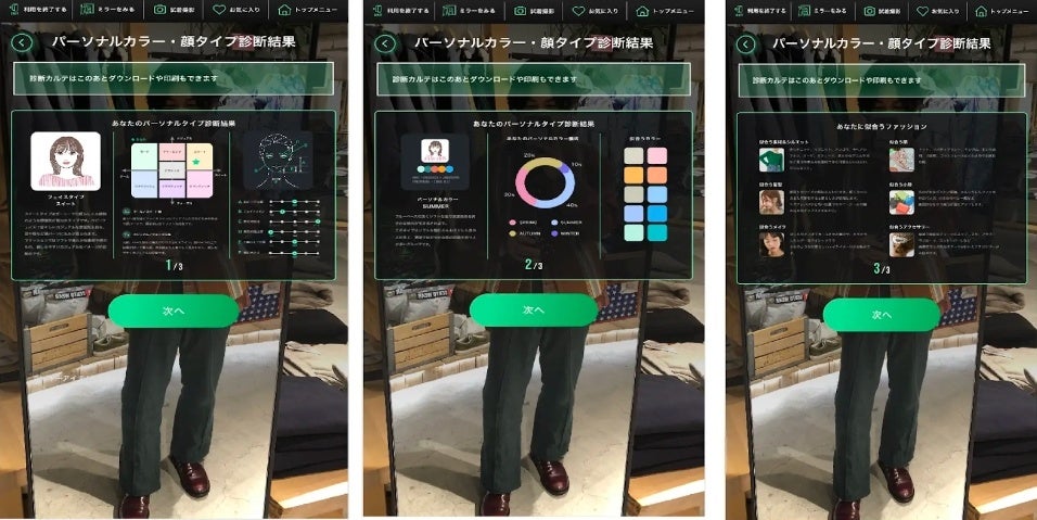 AIカメラで撮影し、フェイス・パーソナルカラーを診断可能に。診断結果からユーザーに似合うおすすめのアイテムとコーディネートを提案いたします。診断結果は紙のカルテやWEBページでもお持ち帰りいただけます。