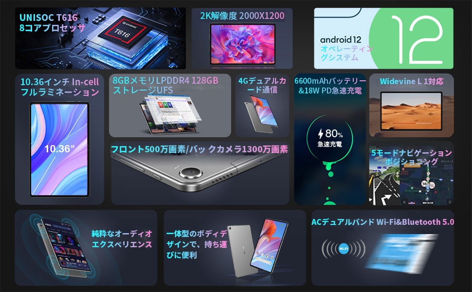 【アップグレード版超高性能8コアタブレット+最新 Android12 タブレット+ 8GB+128GB】 このタブレットは、最新のAndroid 12を搭載しており、最新のアプリケーションやゲームを利用することができます。また、セキュリティ面でも最新の対策が取られており、安心して利用することができます。UNISOC高性能T616、8コア2.0Ghz CPUが搭載なので、少ない消費電力で高速な処理が可能です。GPUには高性能な「Mali-G57」を採用し、グラフィックス処理機能を強化しました。ケームや動画をよりスムーズにお楽しみいただけます。8GB RAMと128GBの高速ストレージを搭載し、アプリを素早く起動させます。更に1TBまでメモリーの拡張ができ、容量を気にせず動画や電子書籍、ゲームや音楽などがダウンロードできます。