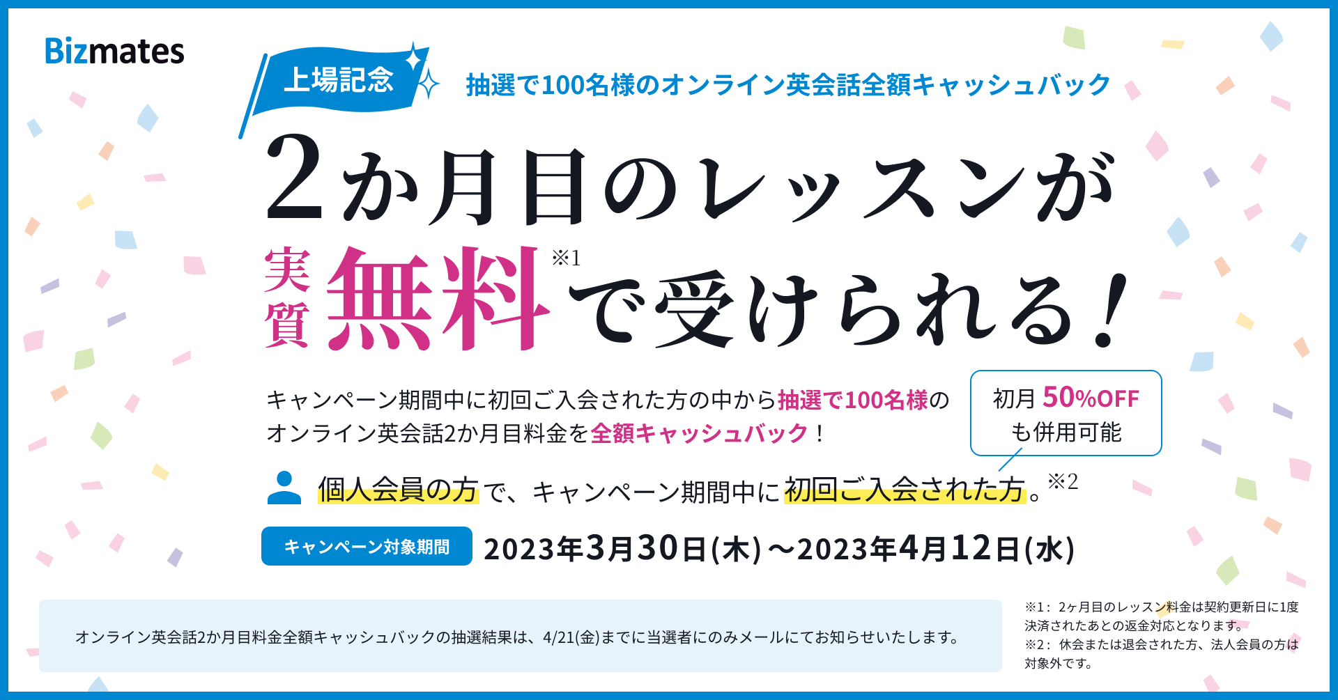 この機会を祝し、ビジネス特化型オンライン英会話「Bizmates」のレッスン料金が実質無料(※1)になる「上場記念キャンペーン」の提供を開始いたしました。
