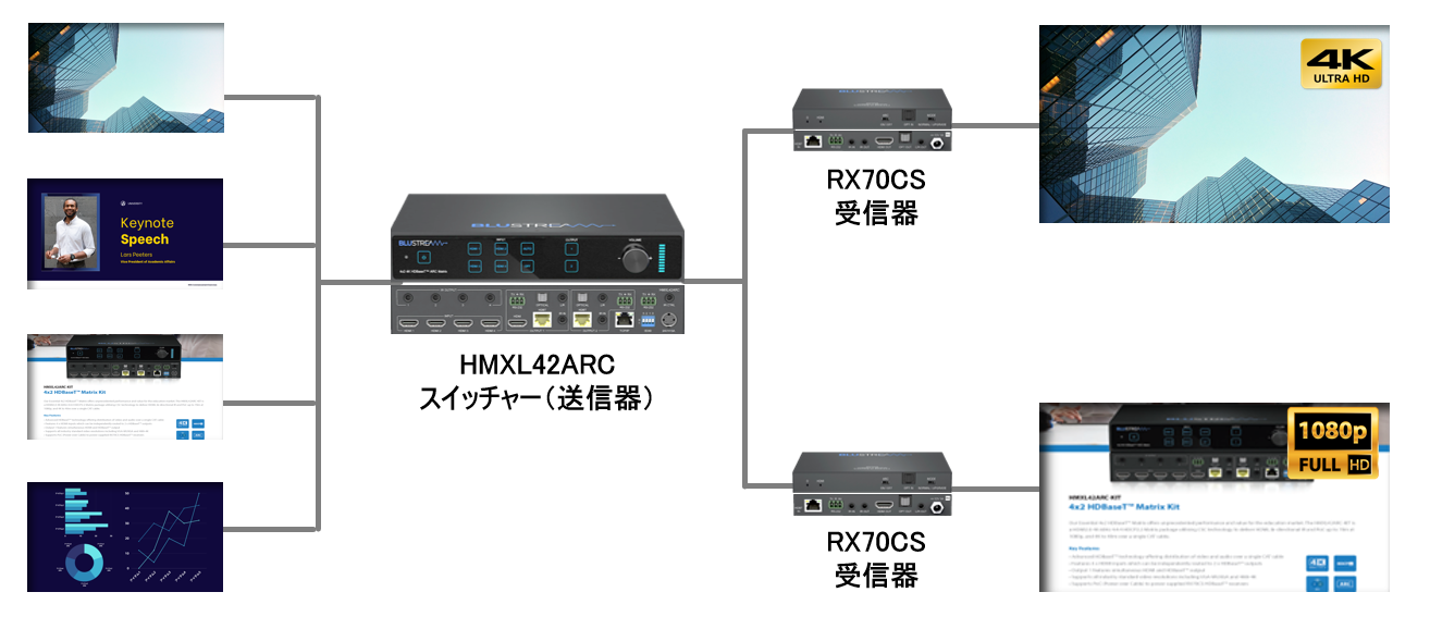 HMXL42ARC-KITは、HDMI入力4系統とHDBaseT出力2系統(内1系統分配出力用HDMI端子搭載)を搭載したマトリックススイッチャーと HDBaseT受信器2台を含むマトリックスエクステンダ-セットです。カラースペース変換(CSC)機能を搭載し最大4K@60Hz 4:4:4(18Gbps)HDMI入力信号に対応。マトリックス送信器とHDBaseT受信器をCat5e以上LANケーブルで接続することで、切替出力した1080p@60HzのHDMI信号を、最大70m(4K@60Hz信号を最大40m)を伝送します。
