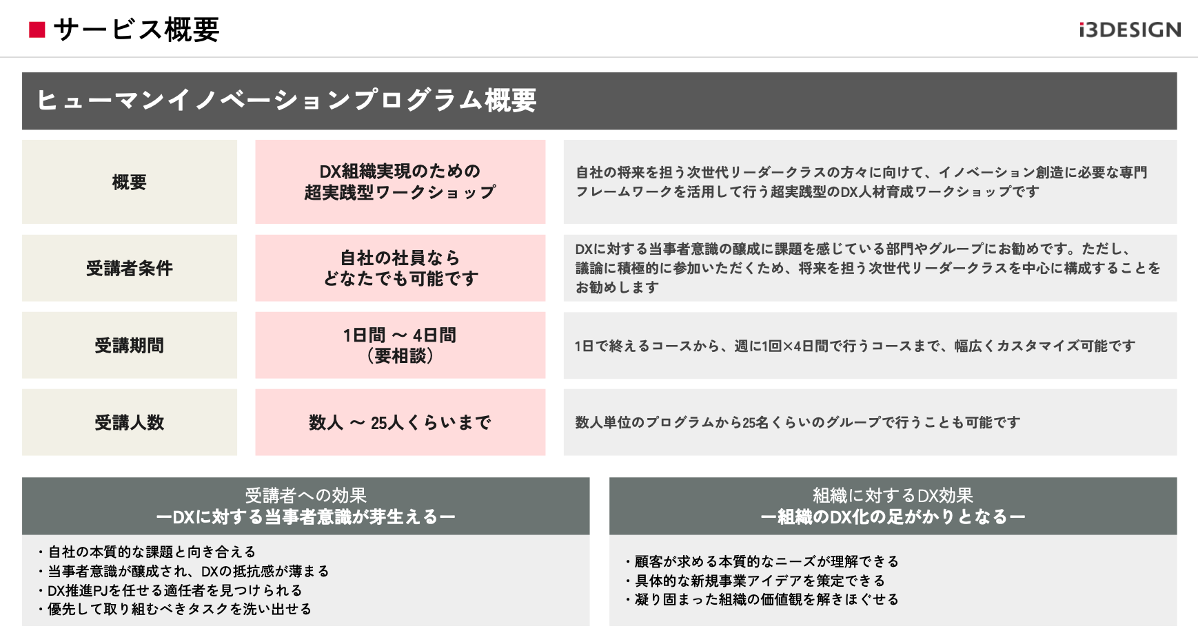 このような状況を受けて、DX時代をリードするための超実践型ワークショップ「ヒューマンイノベーションプログラム」というサービスをリリースしておりますが、新年度からブーストしてもらうために特別キャンペーンを実施することになりました。ビジネスの課題解決に必要なスキルやマインドを身につけ、組織改革を加速させましょう。新年度から一歩進んだDX組織を目指すなら、是非この機会にお問い合わせください。