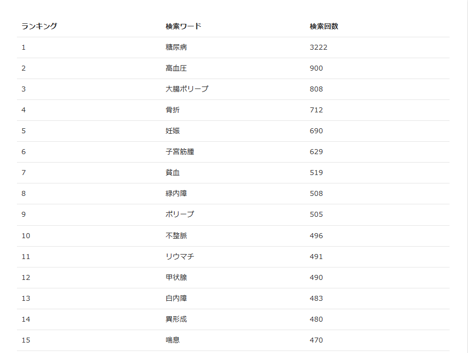 こちらの病名ランキングにつきまして、保険会社ユーザー様には毎月上位1,500個までお渡しさせて頂いておりますが、さらに精度を上げたデータにすべく改善を重ねております。