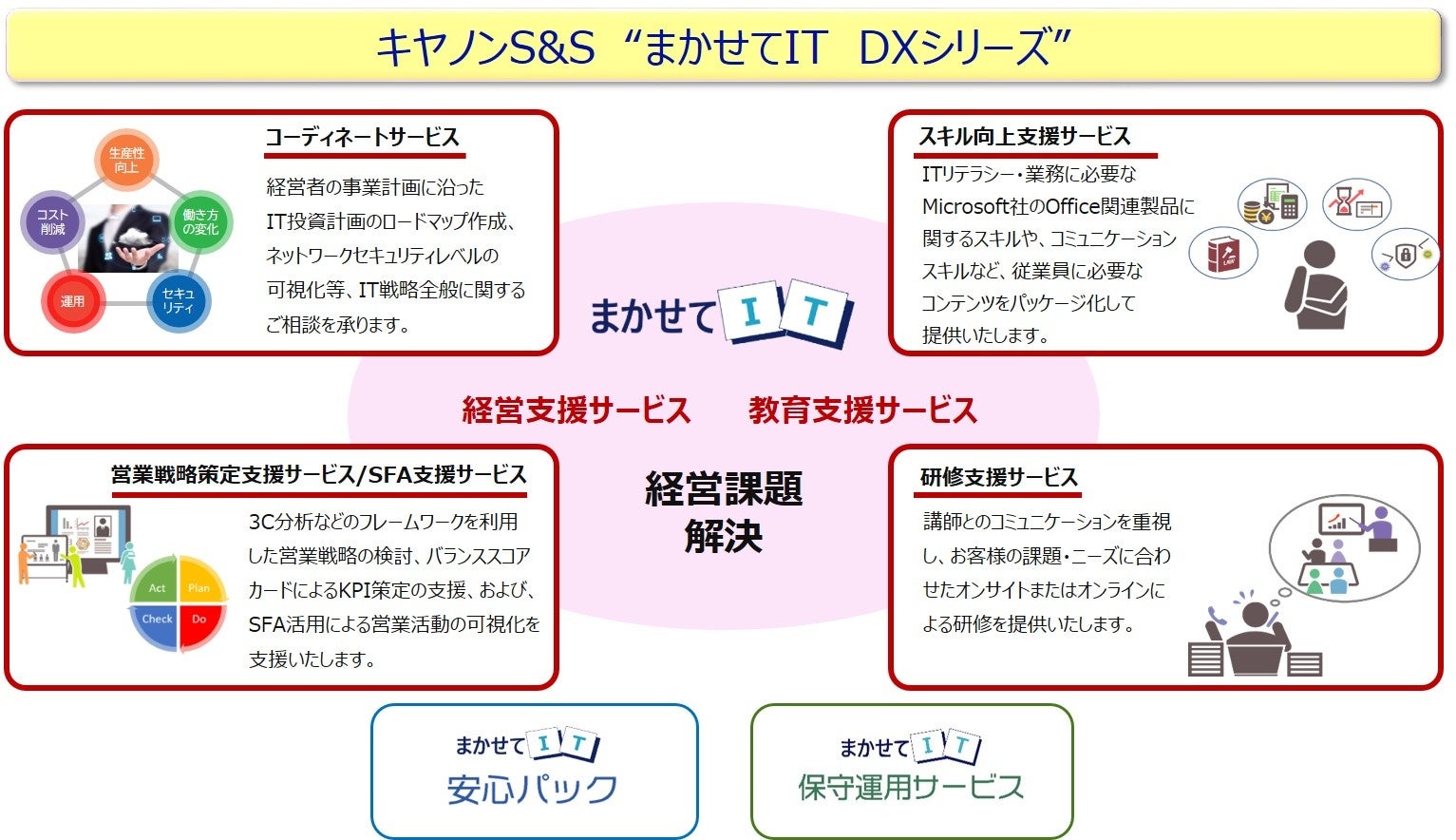 こうした課題に対しキヤノンS&Sは、お客さまのDX実現に向けたITの投資計画から人材育成までを支援し、競争力強化を実現するため、「まかせてIT DXシリーズ」に“経営支援サービス”と“教育支援サービス”を追加します。