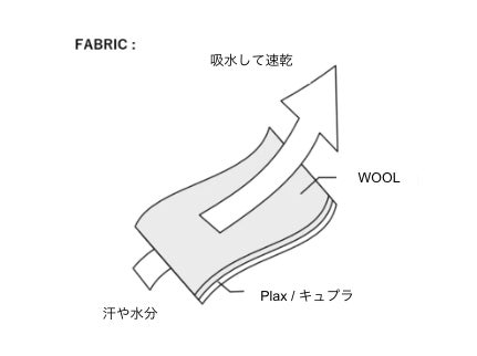 体にかいた汗は、植物由来の2つの合成繊維「PlaX」と「キュプラ」を掛け合わせた裏面によって吸水され、表面の「ウール」に移動し水蒸気として拡散することで、汗冷えを防ぎます。