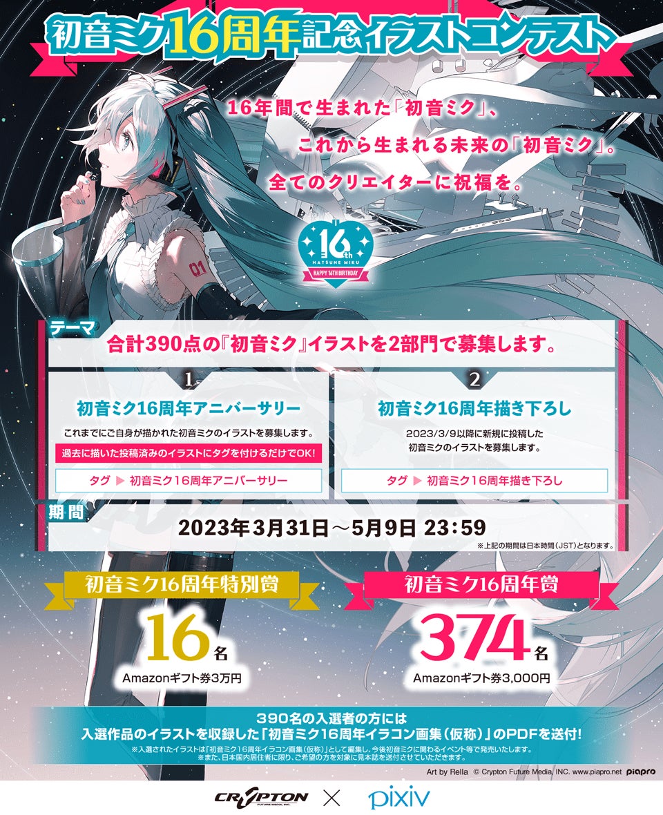 設定年齢16歳のバーチャル・シンガー『初音ミク』は16周年を迎え、今年の誕生日は記念すべき「16回目の誕生日」となります。それを祝してクリプトンが開催するプロジェクト「初音ミク Happy 16th Birthday -Dear Creators-」の企画のひとつとして、同じく今年創業16周年を迎えるピクシブがコラボレーションしたイラストコンテストの開催が決定しました。新規に描き下ろしたイラストはもちろん、これまでに投稿したイラストも応募対象となります。