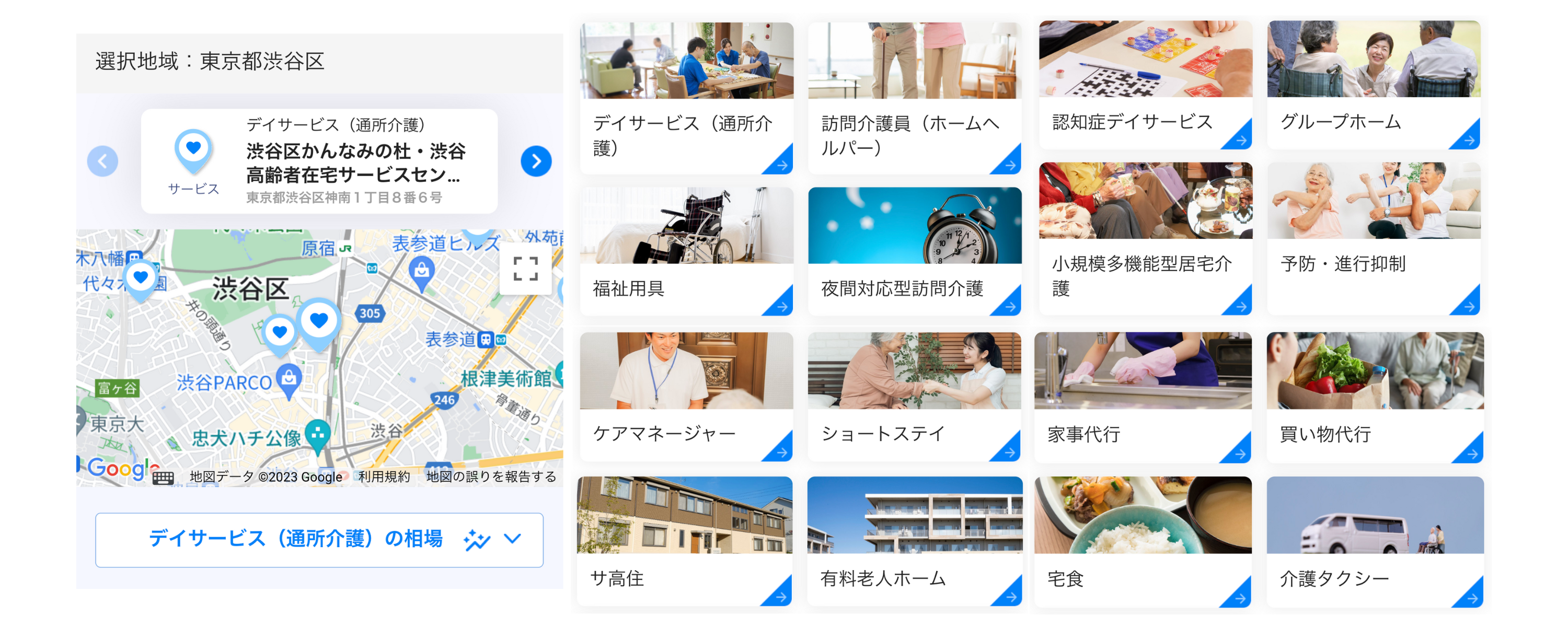- 住所入力から、周辺エリアで利用できる介護サービスの検索