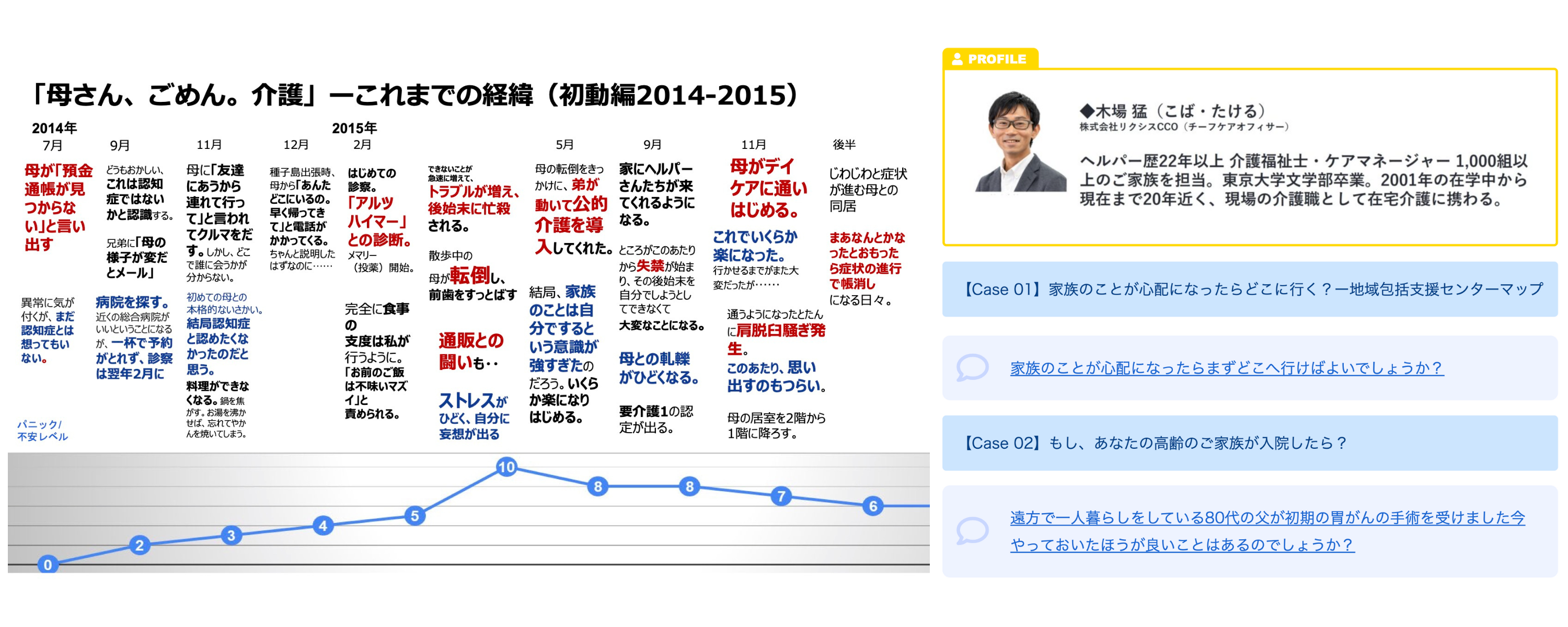 介護が始まった親御さんをもつビジネスケアラーのほか、「今は元気だけど高齢になった親のもしもの時が心配」というビジネスパーソンに対しても、不安を知識に変えるリテラシー向上の記事や、先輩ビジネスケアラー経験談などのコンテンツを提供しています。