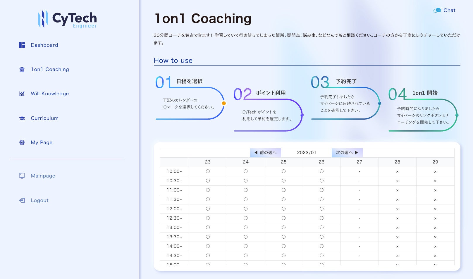 現役エンジニアとセッション可能な「1on1コーチング」機能により、課題として挙がっていた「挫折率」の減少を学習サポート面からアプローチしています。