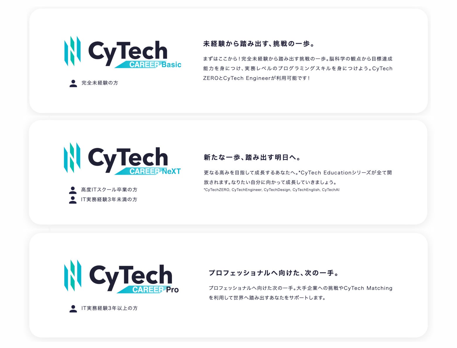 今回のカリキュラム追加を機に、「CyTechEducation(学習)」と「CyTechCarrer(キャリア)」に類別させ各シリーズ化。独立させつつも連動し合うことで、同サービス内で自身の学習やキャリアでの立ち位置を把握することが可能となりました。CyTechCarrerは業界の経験に応じ、次なるキャリアのステップ先が異なります。どの段階からスタートしたとしても「自身が想像できない3年後」が待っているはずです。