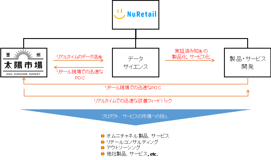 スタートアップにはデータが不可欠ですが、NuRetailはスタートアップでありながら、『亜州太陽市場』というリテールのリアルビジネスも有しており、高いレベルのデータガバナンスを実現しています。また創業者の飯田のグローバルリテールビジネスへの深い知見を生かし、素早い仮説の構築、実効性の高いアクションの見極めを行なっていきます。NuRetailはこのユニークなビジネスモデルにより、オムニチャネルプロダクトやSaaSの迅速な開発を行います。また、飯田は、NuRetail自体をリテールテックのインキュベーション・プラットフォームと見立て、国内外のスタートアップや事業会社にこのユニークな事業環境を開放していく意向を持っており、既に海外の複数スタートアップからコンタクトを受けています。また、国内のスタートアップと共に海外進出を目指した取り組みについても協議を始めています。