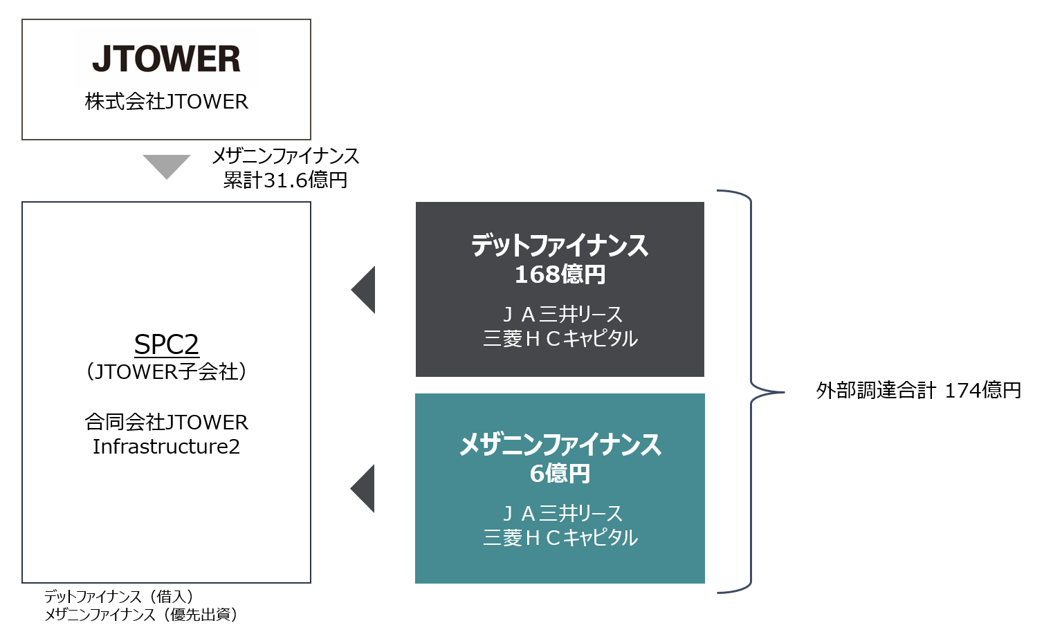 本ファイナンスは総額約174億円となり、JA三井リースおよび三菱HCキャピタルからの借入(デットファイナンス)と優先出資(メザニンファイナンス)によって構成されており、いずれも2022年8月にJTOWERの子会社として設立されたSPC(特別目的会社)である「合同会社 JTOWER Infrastructure2」に対して行われるものになります。