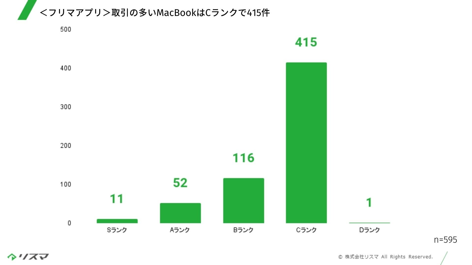 具体的には、2022年10月~12月におけるフリマアプリでのS~DランクiPhone成約総数が44059件に対し、MacBookの成約総数が596件でした。