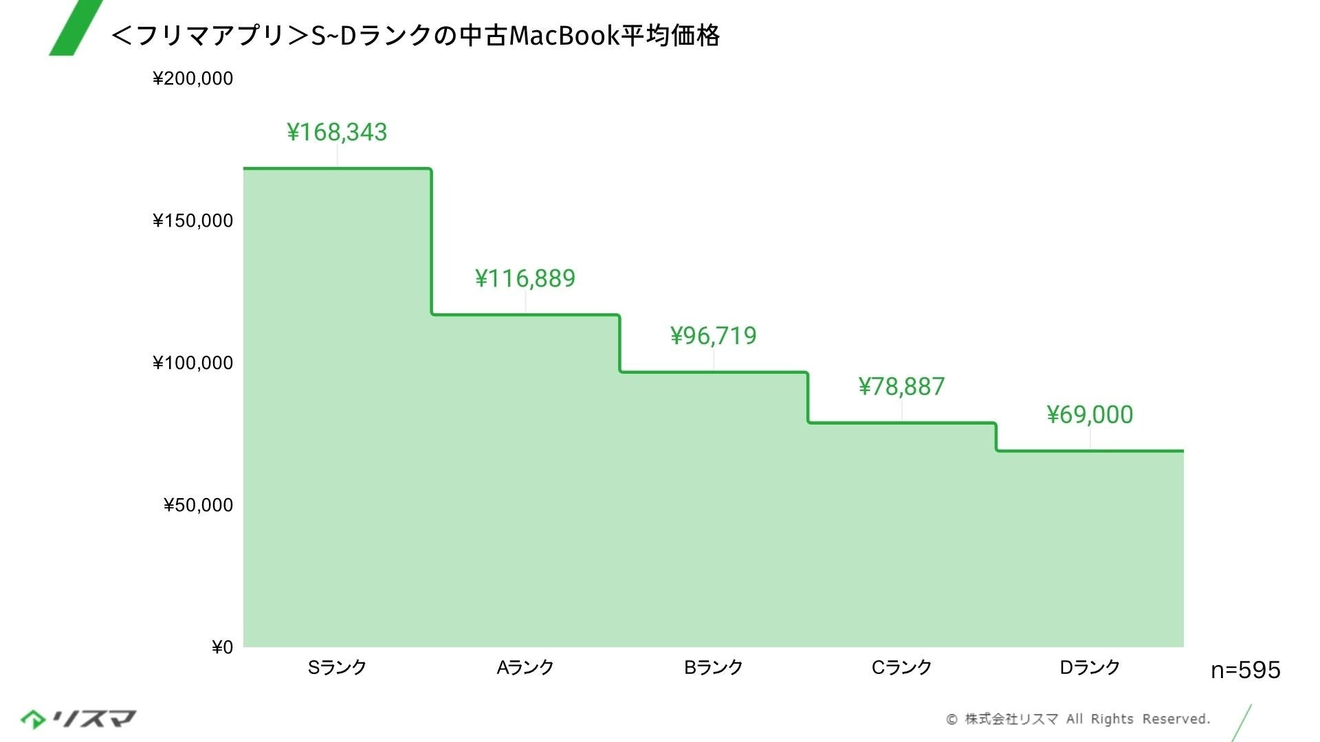フリマアプリにおける、2017年~2022年に発売されたMacBook全体のリセールバリューは、S→A、C→Dランクになる際の下落幅が大きく、1つ下がるごとにおよそ¥20%下落していたことが分かりました。