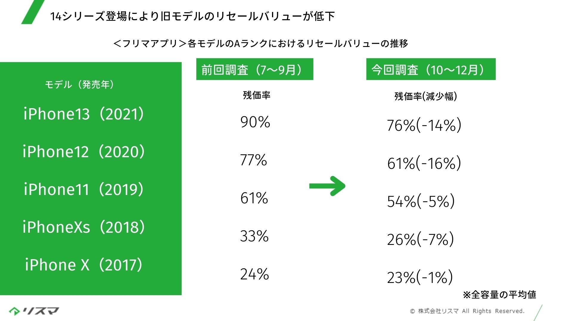 本調査においては2020年に発売されたiPhone12のリセールバリューがiPhone14発売前と比べて-16.51ポイント減の60.71%(全容量平均)でした。