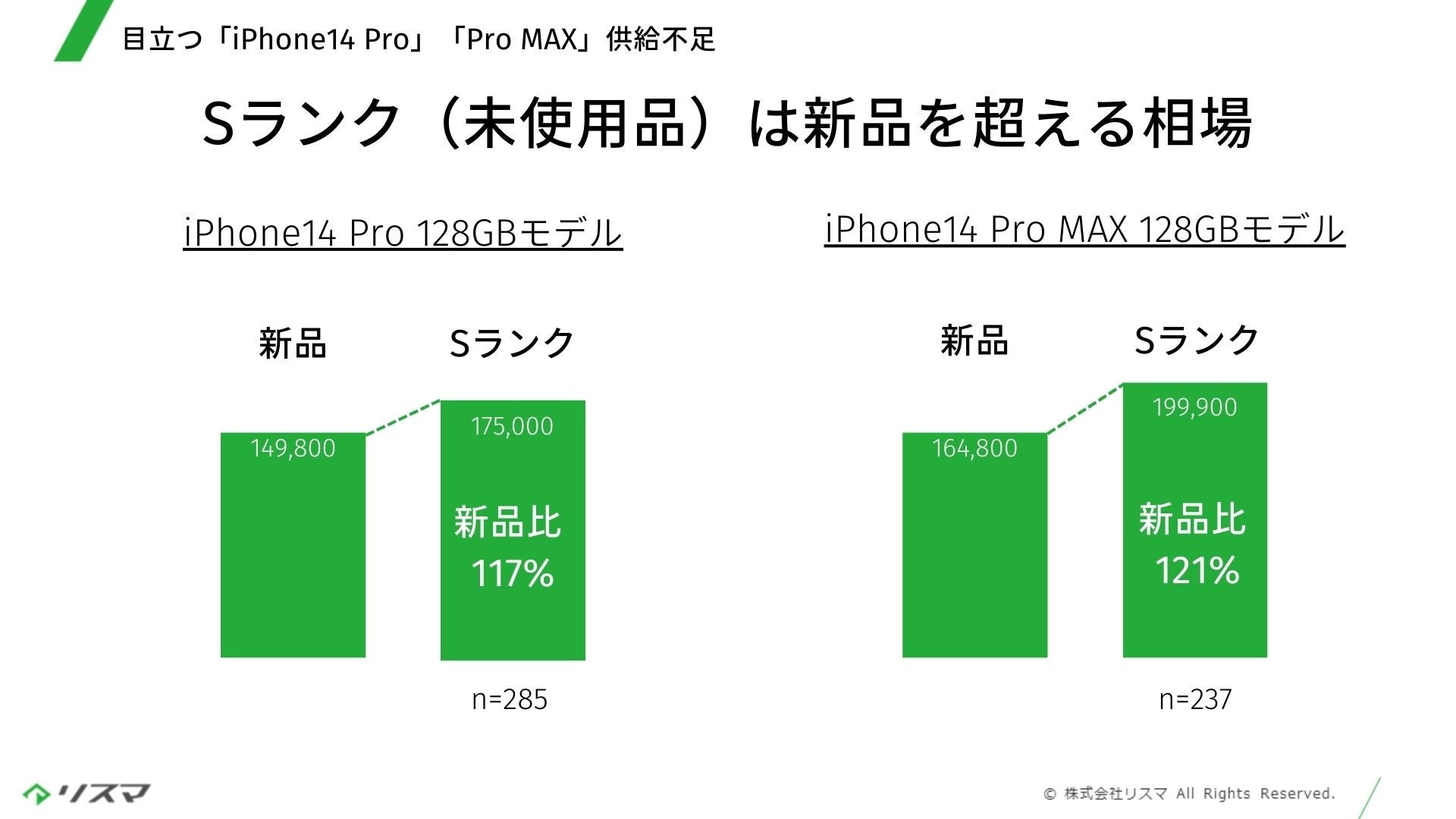 最新のiPhone 14 Proシリーズは「Dynamic Island」(ダイナミックアイランド)と呼ばれるインカメラと通知領域を兼ねたデザインや、常時表示ディスプレイなどの新機能が話題を呼ぶ一方で、昨年秋から冬にかけて品薄となり、入手まで時間がかかる場合がありました。こうした需給バランスを反映し、S・AランクのiPhone14 Proシリーズは定価を超える相場を記録したモデルが見られました。