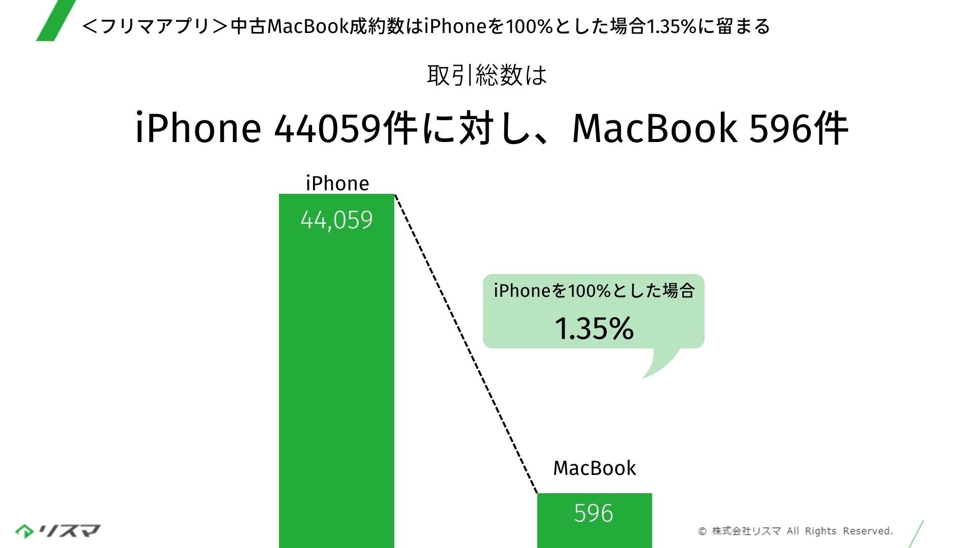 具体的には、2022年10月~12月におけるフリマアプリでのS~DランクiPhone成約総数が44059件に対し、MacBookの成約総数が596件でした。