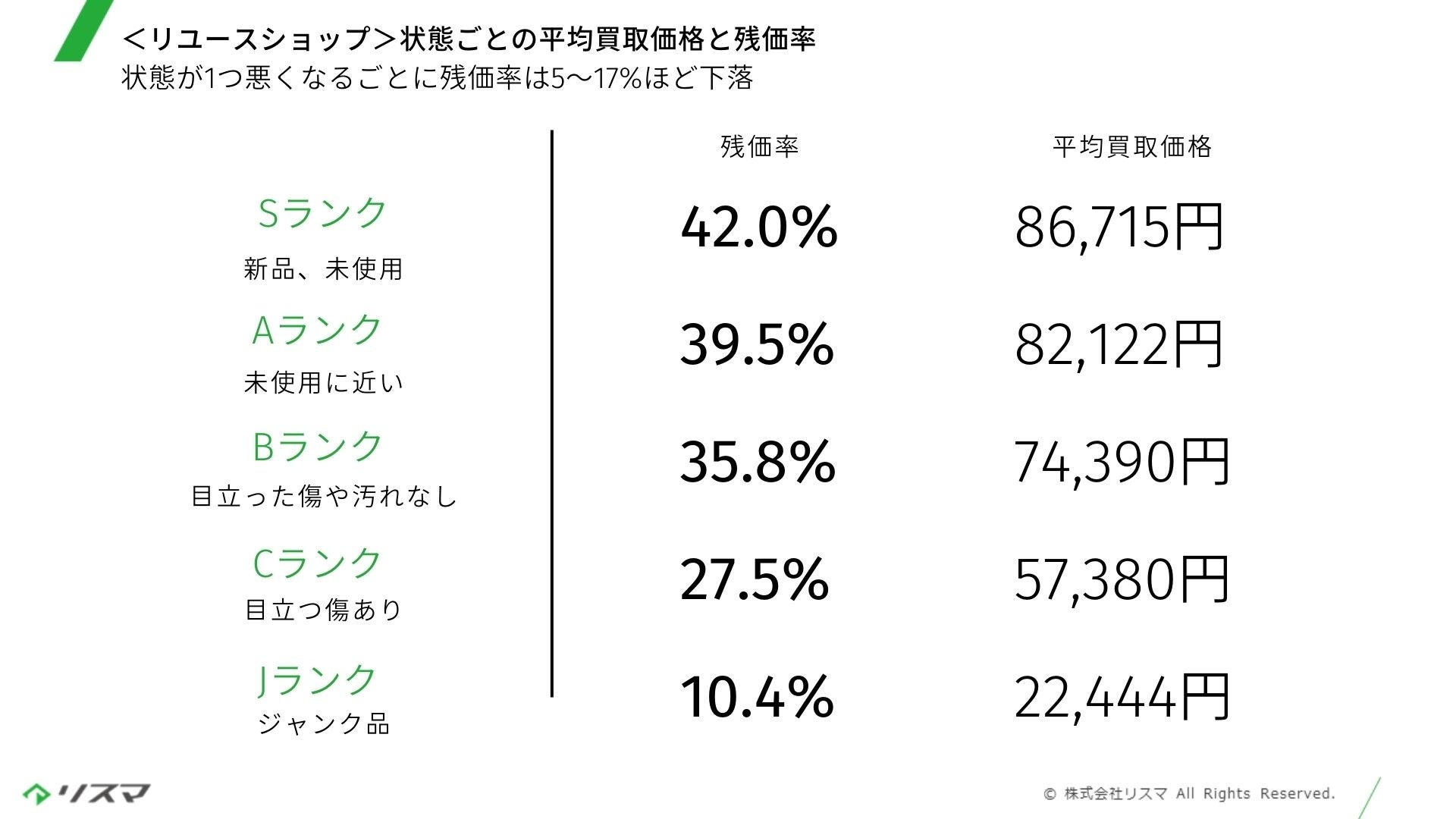 リユース店における各ランクごとの平均買取価格と残価率を調査したところ、Sランクで残価率41.95%となり、未使用に近いAランク(39.47%)、目立った傷のないBランク(35,77%)まで買取金額に大きな差が生まれないことがわかりました。